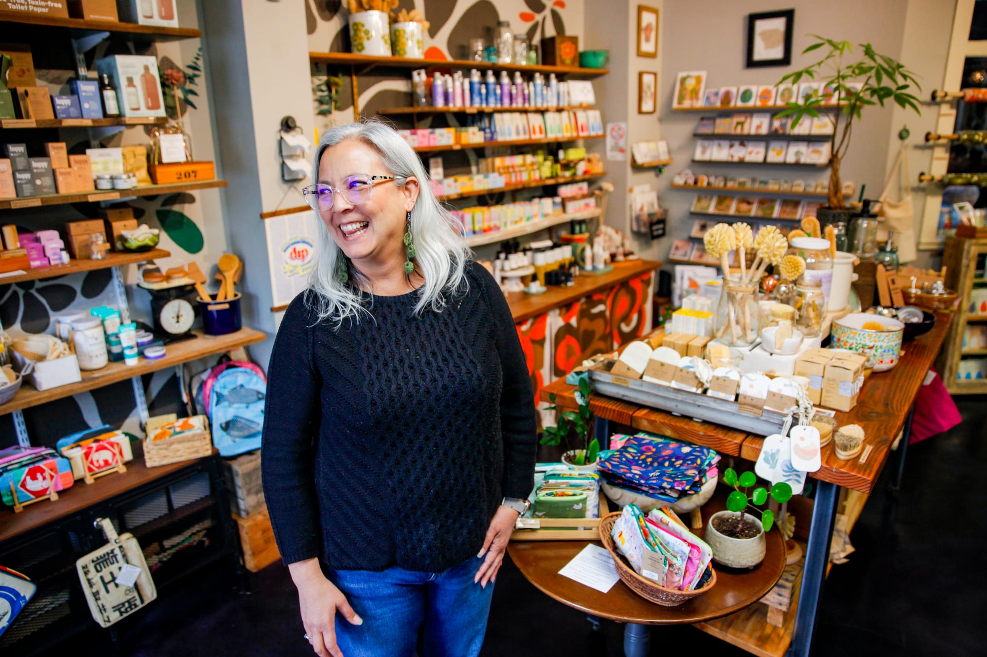 I sling soap! I don’t make any of these products. About 75% of our products are sourced from women-owned companies. I am a co-owner with my husband, Rob. We started this together in 2021 and it’s been really fun! I am a recovering accountant, and Rob was in warehousing and inventory before. [The couple met while working at the clothing store Patagonia in Reno in the late 1990s.]