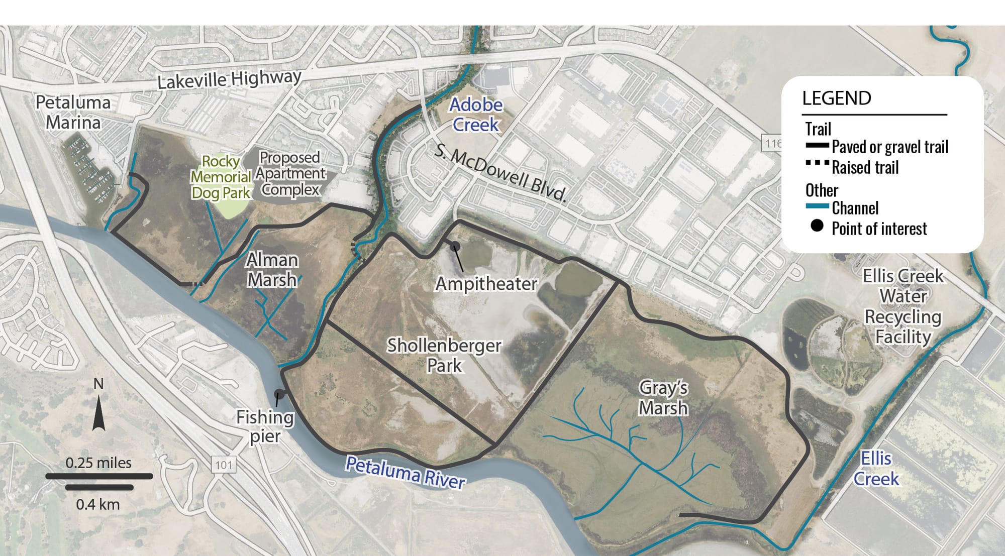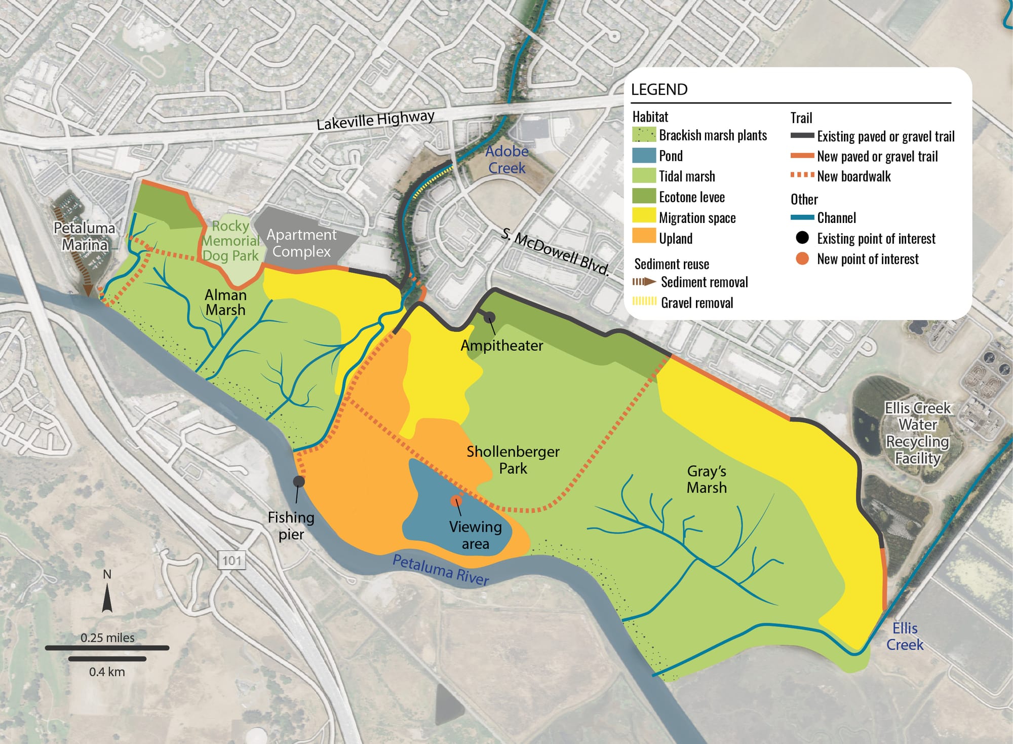 This would include removal of most of the existing levee and the 2.15-mile loop trail that sits atop it. A gravel path on the inland edge of the park would remain, connecting to the Ellis Creek Water Recycling Facility as it does now. Elsewhere, boardwalks would be built over the newly restored marsh leading to a fishing pier on the river, as well as across the middle of the marsh past a new seasonal pond – but not along the riverfront like today.