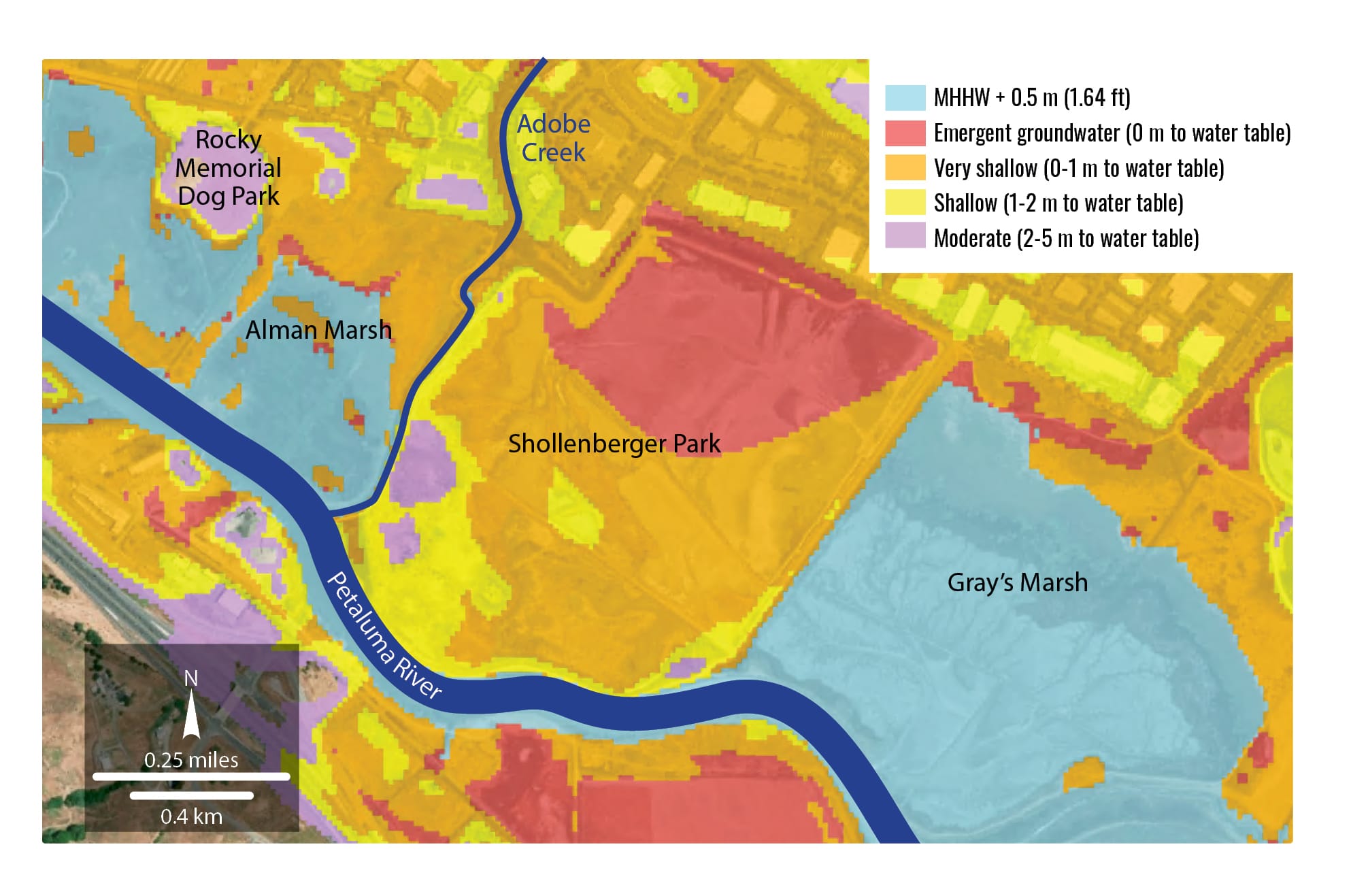 But as sea level rise maps in the new report reveal, the site’s future for both recreation and dredge disposal is at risk. The existing levee is sufficient to hold back the river itself for decades to come, but groundwater rise – the increasing elevation of the subsurface water table caused by sea level rise – threatens to impact the lower, eastern half of the park, including near the parking lot and bathrooms.