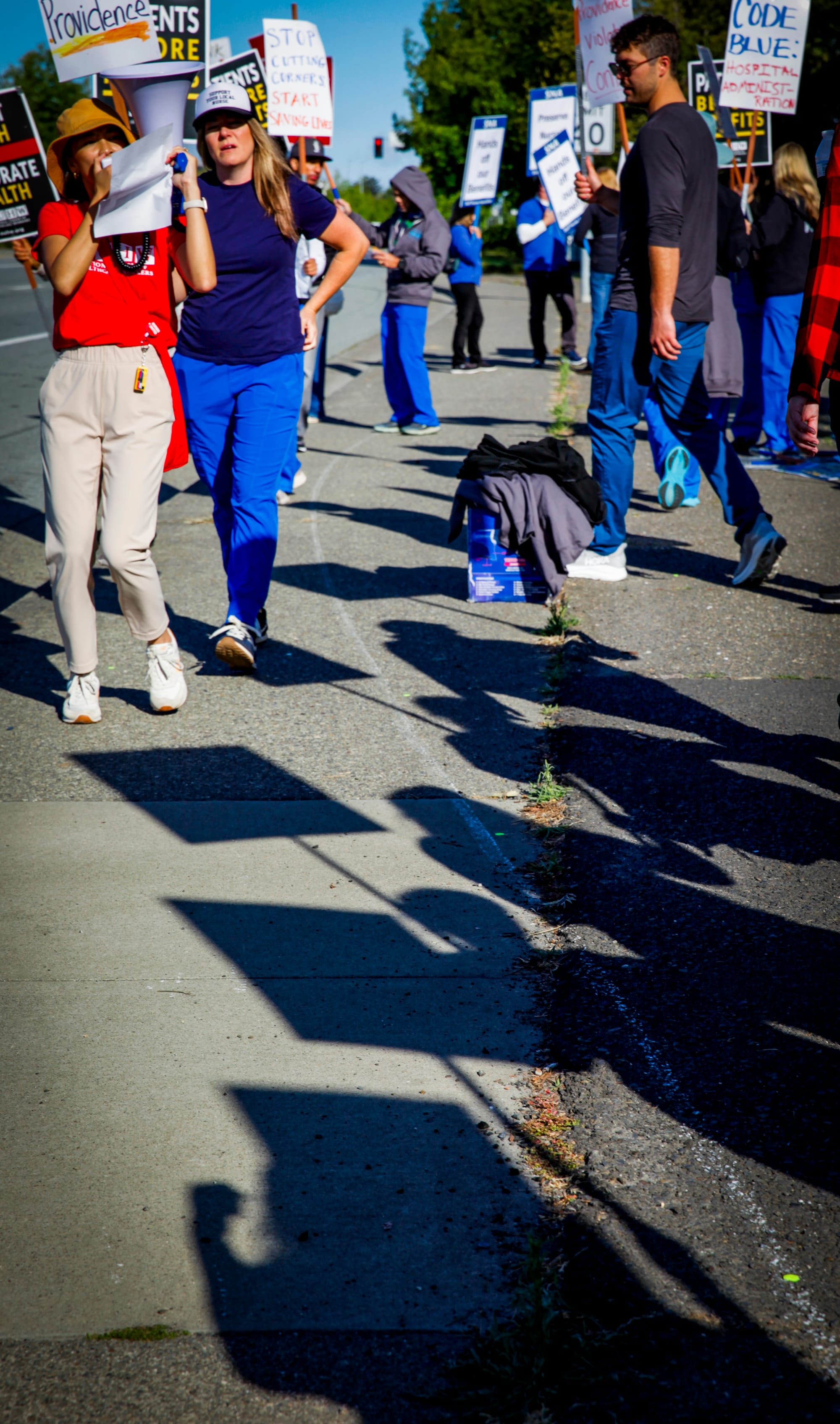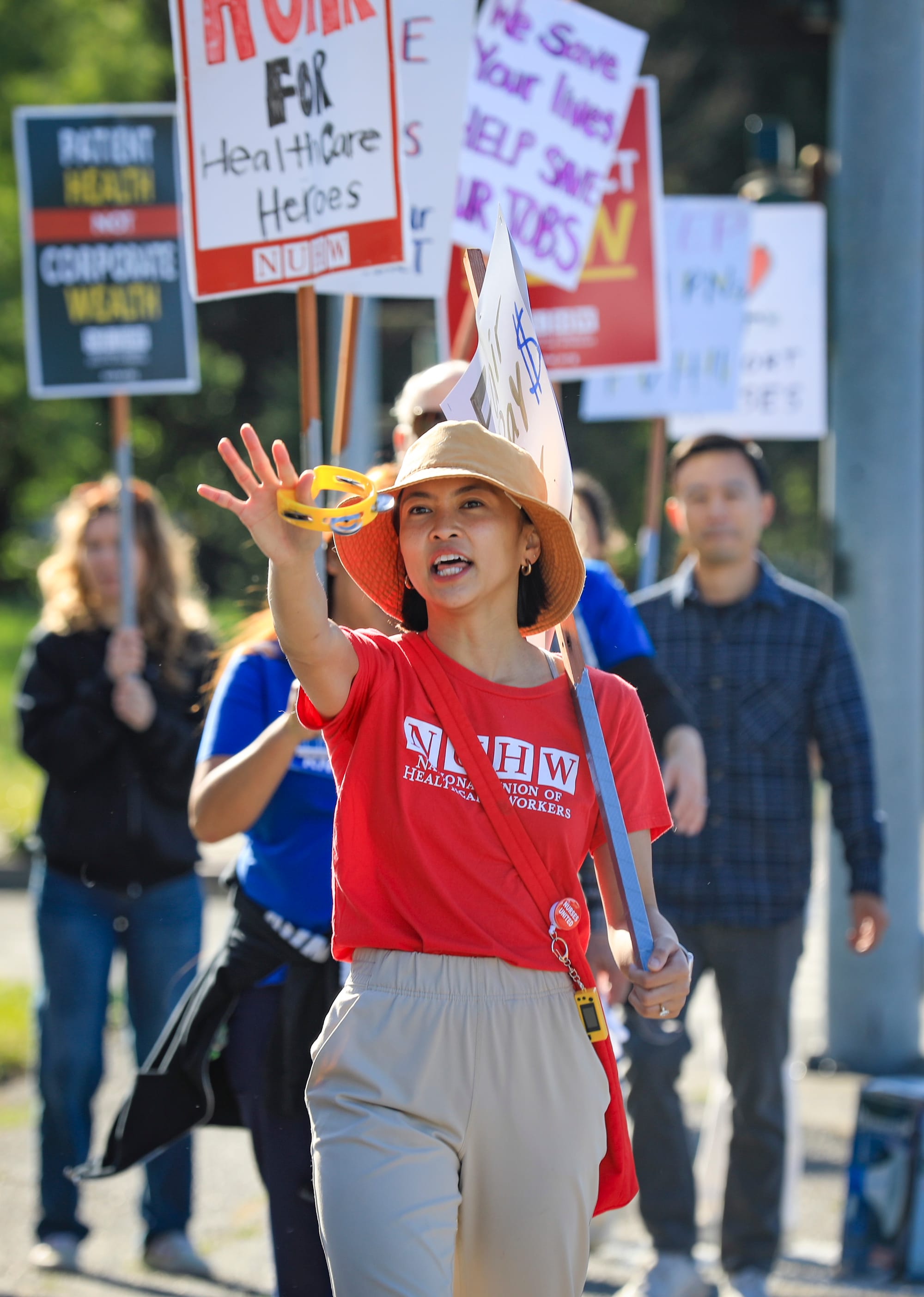 Nurse case manager Catherine Canto (photo on left), who has been at Petaluma Valley Hospital for five years, says she loves working there and that it is a great community hospital where patients can feel that love. She says she marches because she wants Providence to recognize that their nurses are the lowest-paid in the county and deserve better. CRISSY PASCUAL/PETALUMA VOICE ©2026