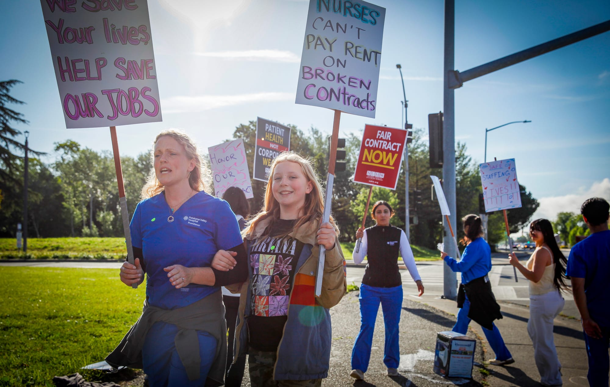 Allison Arnold (far left) is accompanied by her daughter Amelia, 10, during a picket outside Petaluma Valley Hospital on Tuesday, April 14, 2026. Arnold said one of the best educations she could give to her daughter is to teach her about standing up for herself. “If we don’t show up we will get stepped on.” CRISSY PASCUAL/PETALUMA VOICE ©2026