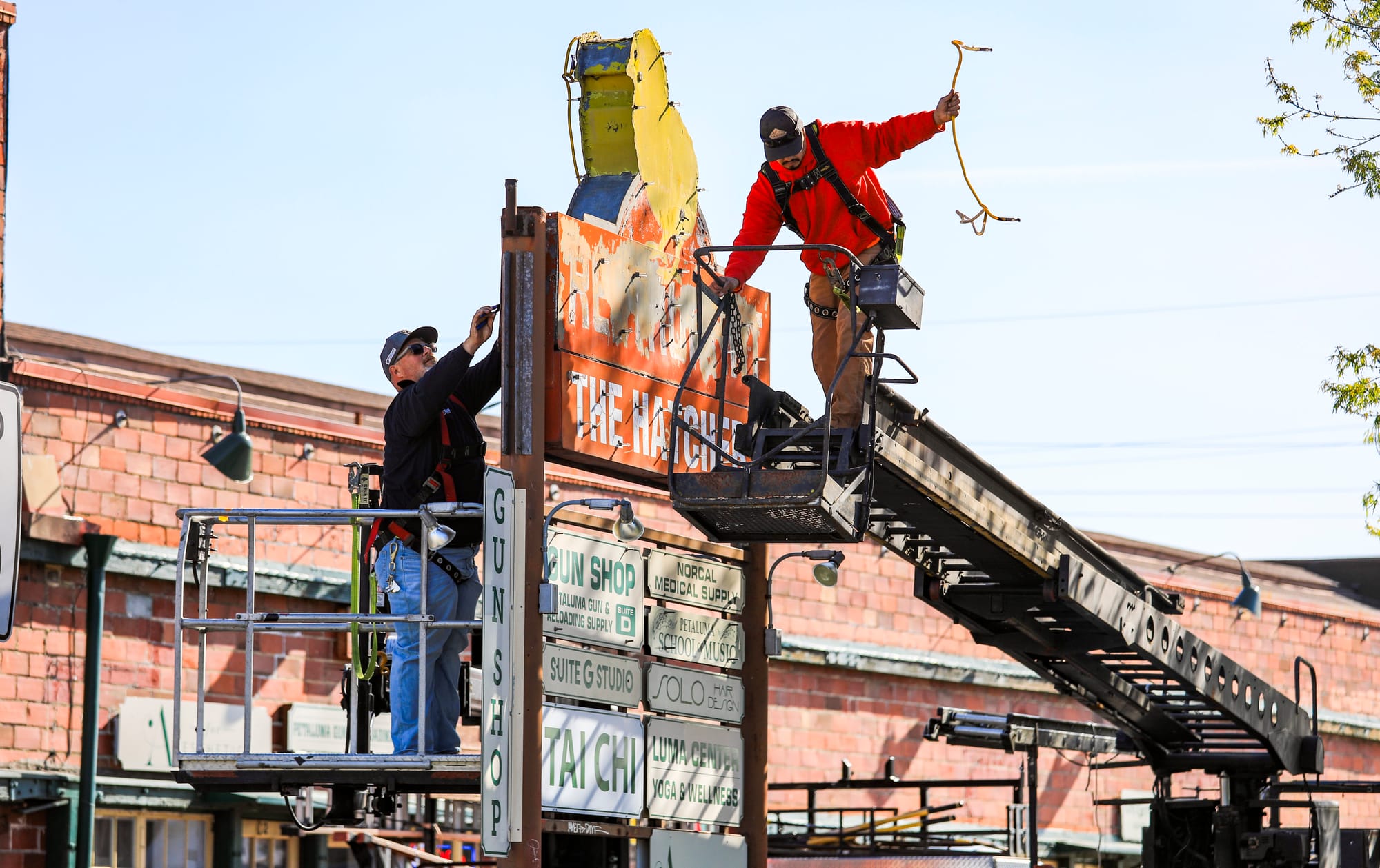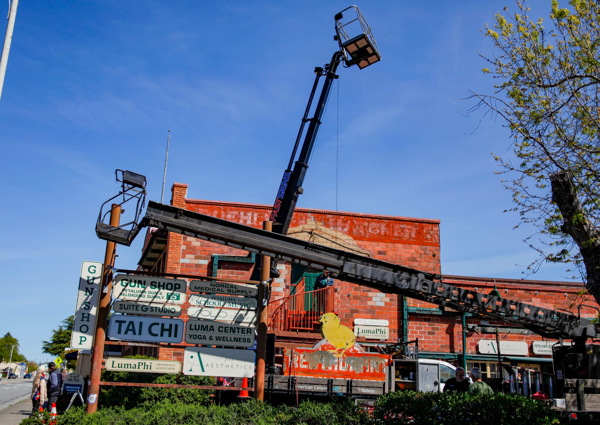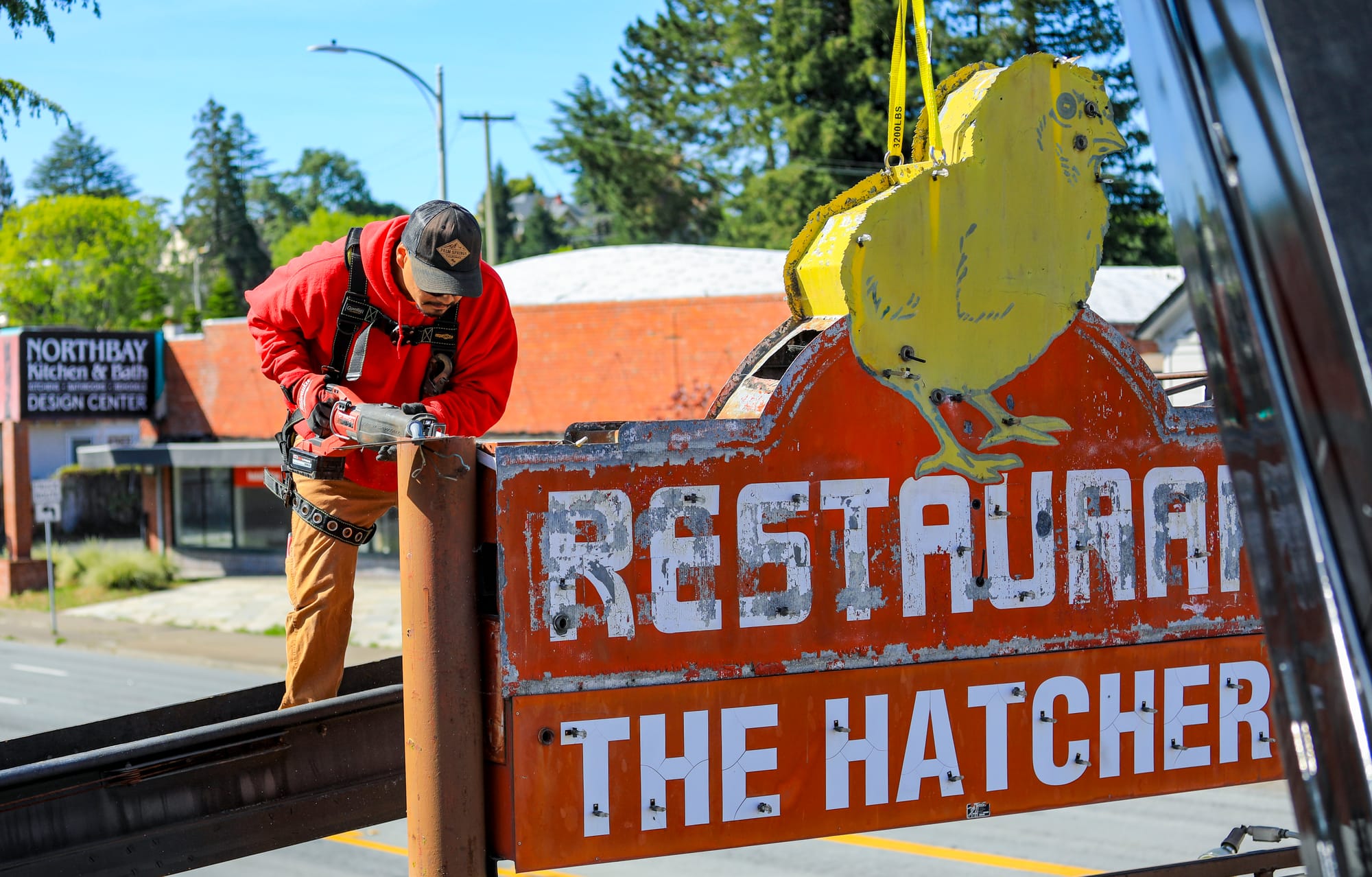 A campaign by the Petaluma Signs Project reached its fundraising goal to restore a 91-year-old neon chick sign on Petaluma Boulevard, and a crew removed the sign on Thursday, April 16, at 10:34 a.m. to begin restoration. The iconic Petaluma sign will return with fresh paint and new neon lights to once again adorn the former Poehlmann Hatchery. The campaign was spearheaded by local historian Katherine Rinehart (in center photo). The sign will be hand-painted by local sign makers Mark and Paul Barber (bottom left photo), sons of Warren Barber of Barber Signs. Photos by CRISSY PASCUAL/PETALUMA VOICE ©2026