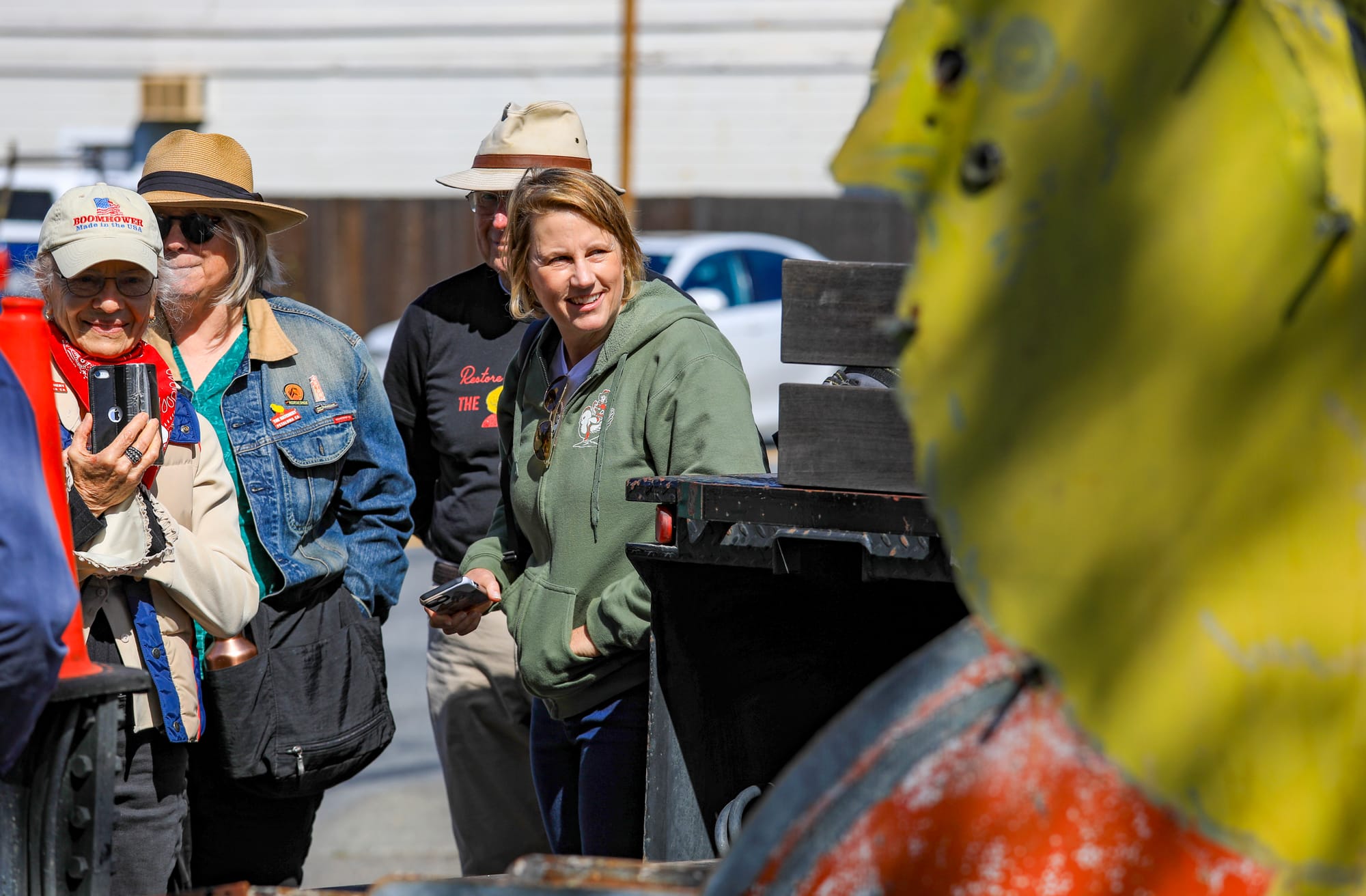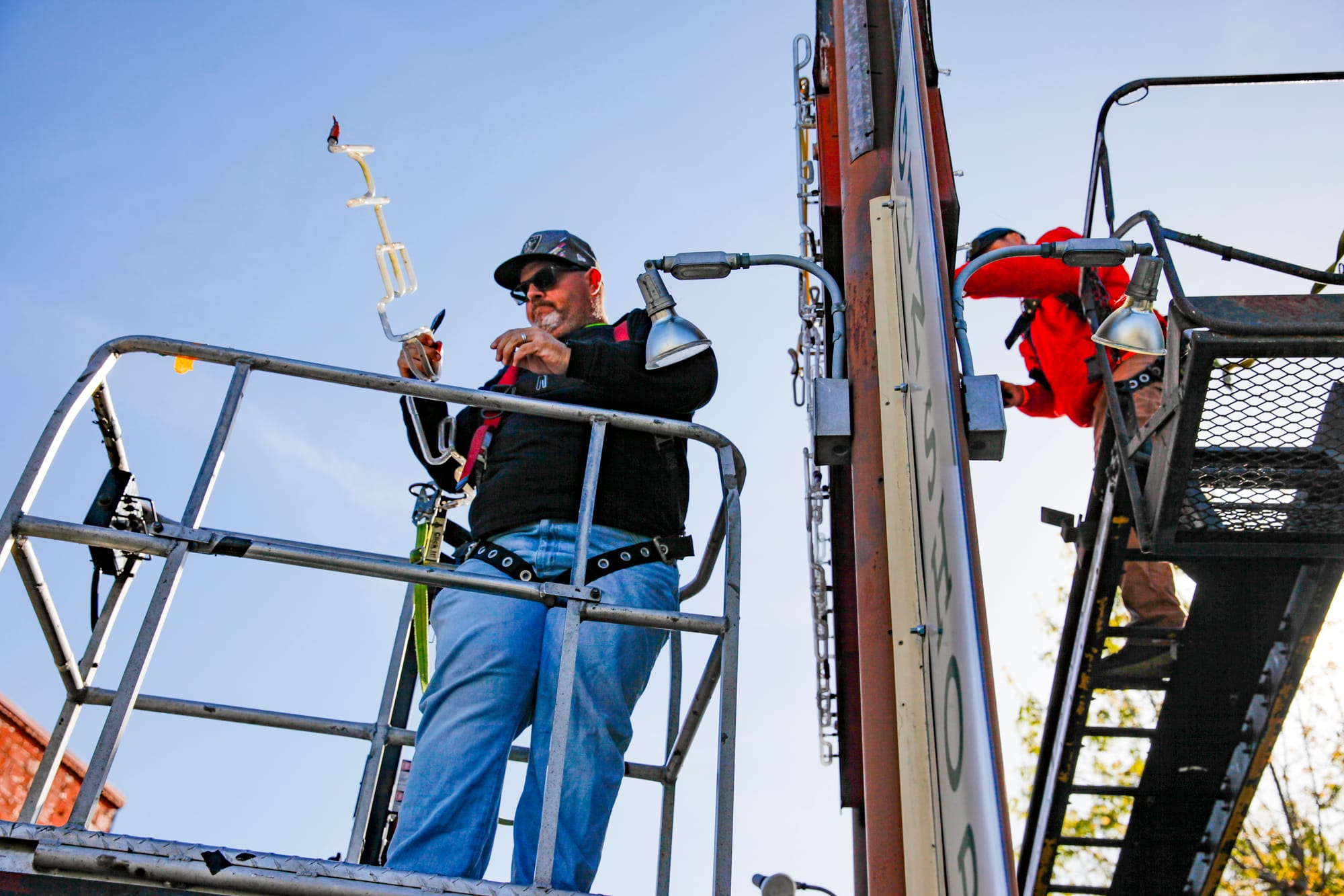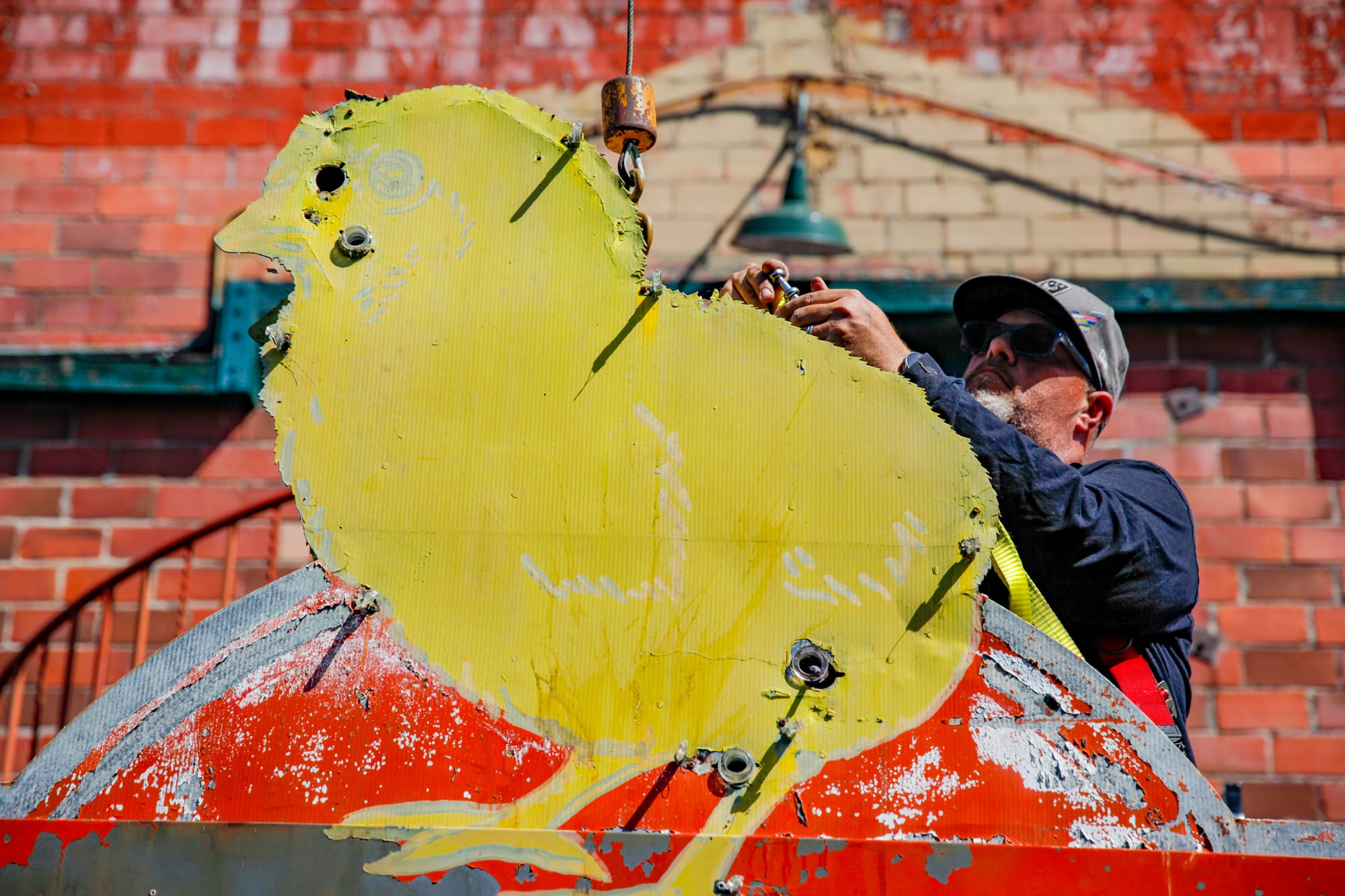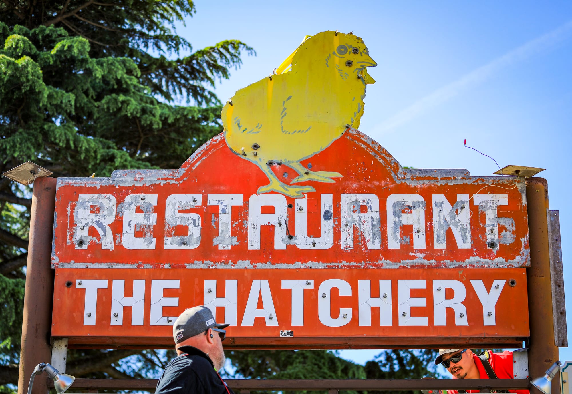 A campaign by the Petaluma Signs Project reached its fundraising goal to restore a 91-year-old neon chick sign on Petaluma Boulevard, and a crew removed the sign on Thursday, April 16, at 10:34 a.m. to begin restoration. The iconic Petaluma sign will return with fresh paint and new neon lights to once again adorn the former Poehlmann Hatchery. The campaign was spearheaded by local historian Katherine Rinehart (in center photo). The sign will be hand-painted by local sign makers Mark and Paul Barber (bottom left photo), sons of Warren Barber of Barber Signs. Photos by CRISSY PASCUAL/PETALUMA VOICE ©2026